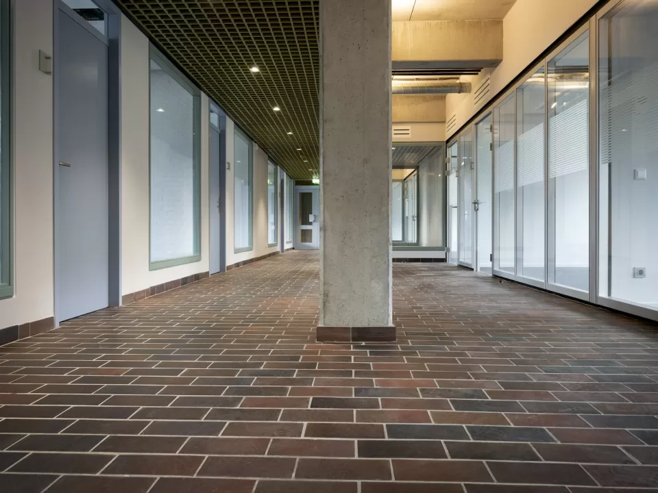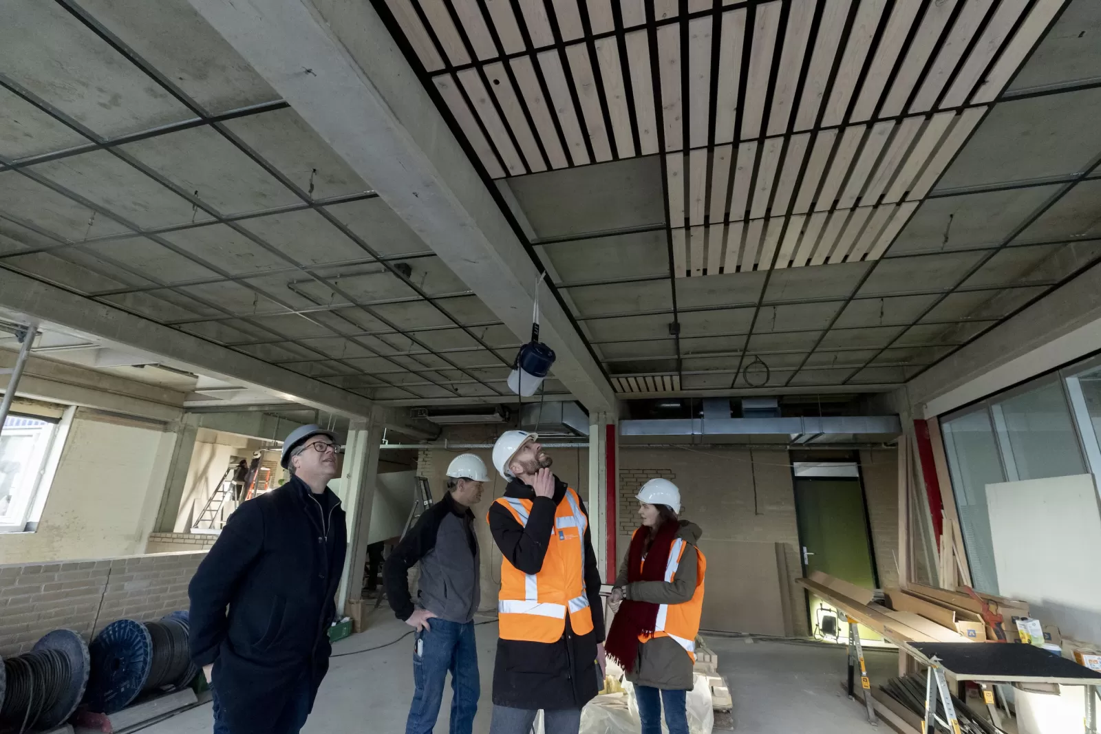Dat heeft als resultaat opgeleverd dat bijna alles wat je ziet in het gebouw hergebruik betreft: demontabele keukenblokken, klimaatplafonds, balustrade gemaakt van uitgezaagde metselwerk elementen, kozijnen uit hergebruikt hout samengesteld, luchtbehandelingskast, keramische vloertegels, verlichtingsarmaturen, houten plafondelementen, glazen binnenwanden, koelmachine, tapijttegels… de lijst is hiermee nog lang niet compleet, en er valt zoveel over te vertellen! Zowel op het gebied van afbouw, installaties, constructie, bouwkunde, brandveiligheid en bouwfysica zijn er veel verschillende vernieuwende en vooruitstrevende voorbeelden te zien. Of eigenlijk, vaak juist níét te zien! Het afwerkingsniveau is hoogwaardig en doet niet onder voor nieuw.